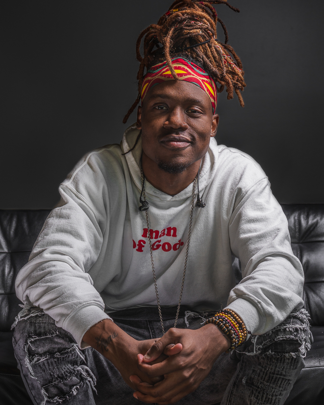 This guy is Kevi. He's a rapper I met during a Christmas party. Since there were some leather couches around I decide to light from above to create more a of an overhead light look and tossed in a reflector on the left to open up the shadows under his chin. I wanted it to look fun to match his personality but still maintain an edge about it for the masculine and rapper side. He loved the final product so that's what matters most.