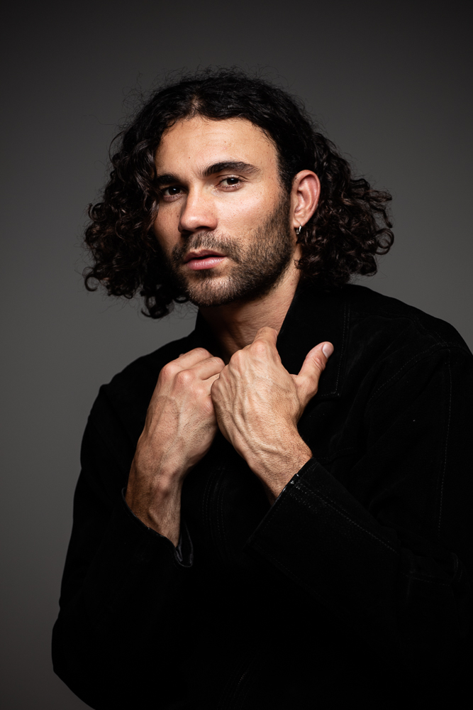This is a capture of Nelson, he is a relation of mine so he was happy to work on some lighting setups in the studio, I'm very new to the studio setups and been focusing on the standard looks and to also bring something from my art style to my studio headshots, and in this image, I choose to shoot with one light to give me that challenge of using one angle of light that mimics my locations shoots with only using the sun. Using a harsh narrow light I wanted to capture nelson in a strong pose but also vulnerable while using less colour and the negative space of the backdrop and outfit to focus on his face and hands, working the hands to lead the eye to his face. I had this all in my head and was just casually directing nelson to get the pose I wanted but in a natural relaxed feel. Just used contrast and slight crop to finish the image to keep his look as naturally possible. From this image, we worked on an outfit change to colour and more of a relaxed face and smiling with the eyes.
