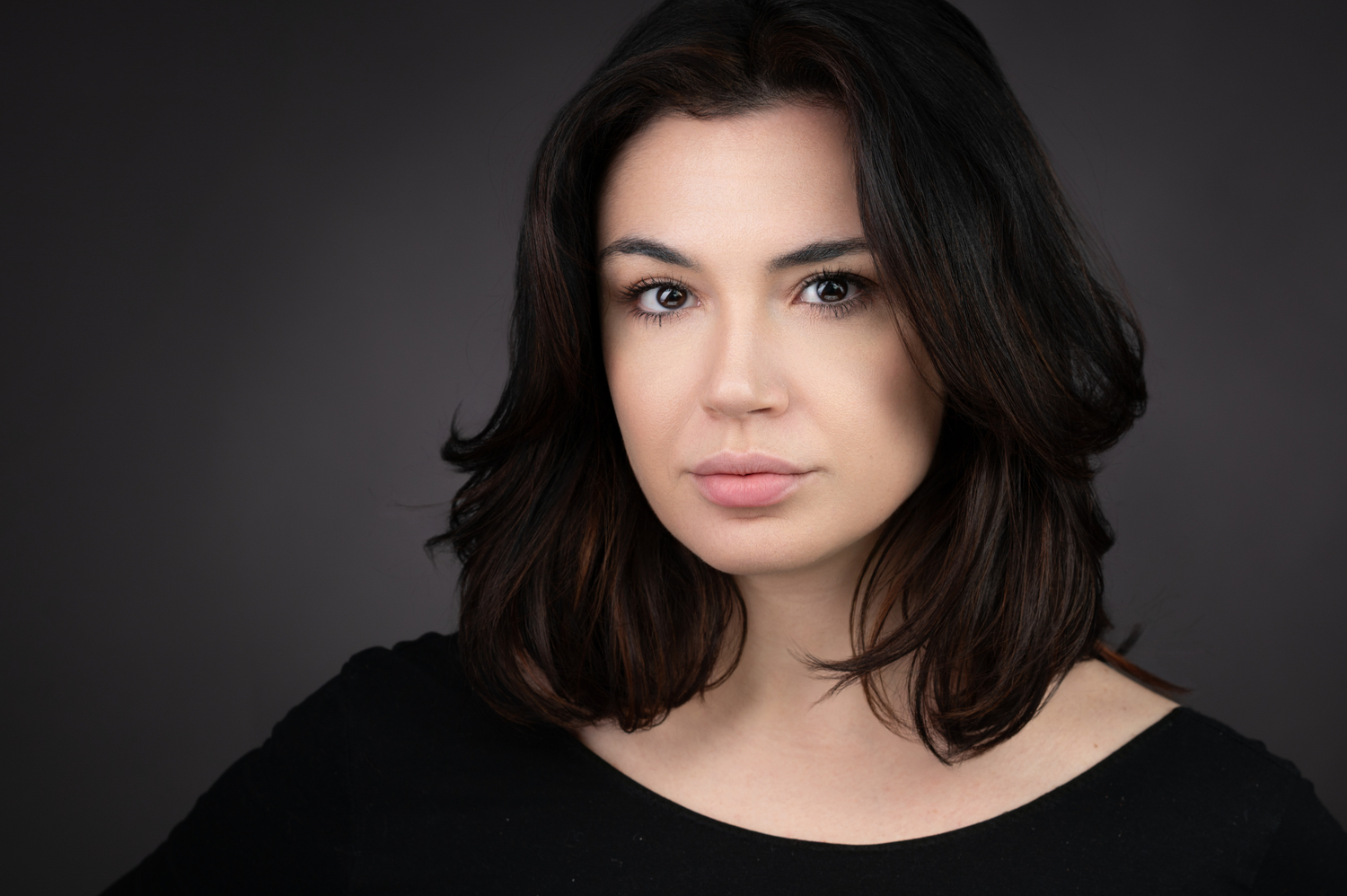 Used the Hurley triangular setup with stripboxes. Shot the Nikon S 1.8 85mm lens at F7.1. Lit the gray background with a tight snoot to give some separation.