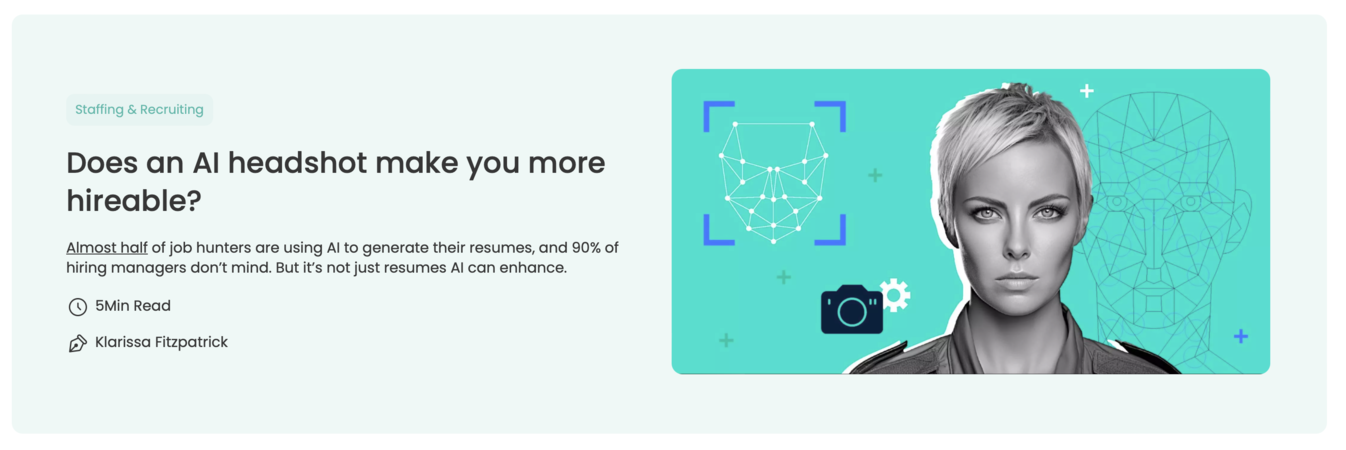 The interesting thing is the reaction when a majority of recruiters feel mislead by someone if they find they’ve used an AI headshot. This is a key issue that people should be concerned about. If your AI-generated headshot doesn’t look like you in person, that recruiter or HR person meeting you in real time can feel misled. And then wonder what else you’re misleading them about. It calls into question if their resume was embellished, if they’re willing to cut corners to complete a project, for example. There are unforeseen consequences to going the AI route that some people don’t seem to realize.